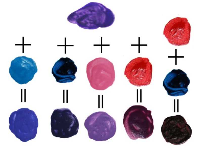 Во время смешивания важно обращать внимание на степень насыщенности и чистоту синего, а также красного цвета – от этого будут зависеть характеристики конечного цвета. Если в комплекте красок есть чистый фиолетовый, то для создания оттенков лучше применять его. Полученные оттенки будут более насыщенными и не такими бледными, нежели те, что созданы путем смешивания синего и красного