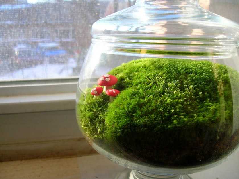 Во флористике чаще всего применяют стабилизированный (законсервированный) мох. Воду в нем заменяет специальная жидкость, которая останавливает все процессы жизнедеятельности и как бы бальзамирует растение. Для начинающих цветоводов подойдет сфагнум или эпифиты, растущие во влажных местах. Особо ухода культура не требует – ее просто выкладывают на дно мини-сада.