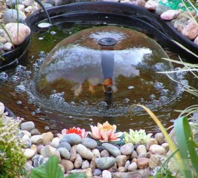 Отдельного внимания заслуживает плавающий фонтан фабричного изготовления. Его можно зафиксировать то в одном, то в другом месте. В большом водоеме уместно разместить несколько факелов рассыпающейся воды.
