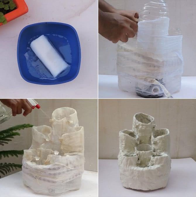 Пока ткань подсыхает, нужно приготовить из белого цемента раствор и нанести его тонким слоем на обмотанную конструкцию, стараясь не закрывать светодиодную ленту. Марля высыхает очень быстро, поэтому потребуется пульверизатор с водой.
