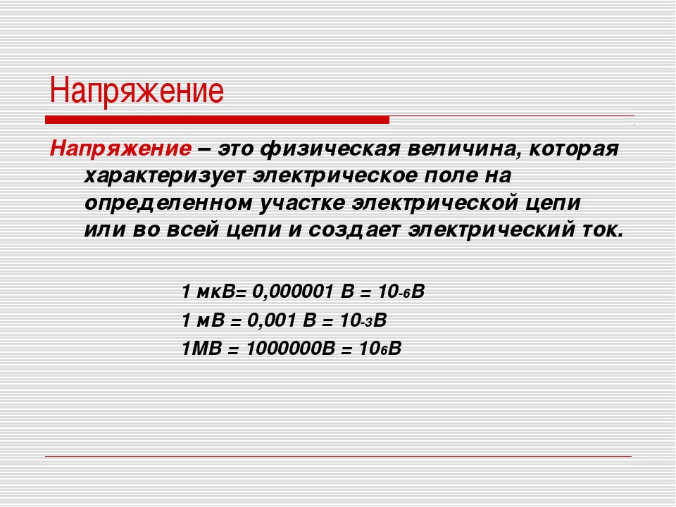 Напряжение это физическая величина, показывающая размер тока в цепи и оборудовании в вольтах. Ток бывает постоянным и переменным. Отличие в том, что первое понятие обозначает, что ток постоянно меняет свою полярность и протекает в сети переменно. Во втором же случае ток проходит по электроцепи без перерывов. Измеряется вольтметром.