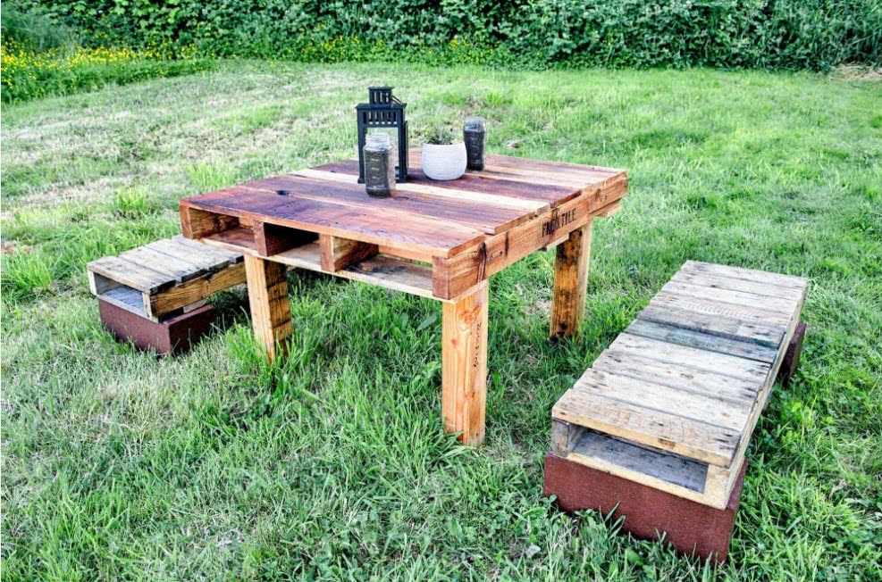 Пример первый. Этот проект можно назвать классическим, вы наверно видели в интернете много подобных фотографий скамейки из блоков. Модель привлекательная своей простотой и надежностью, а для изготовления не требуется вообще никаких навыков – просто берете и собираете. Хотя, если не хотите покупать готовые доски, придется сделать их своими руками.