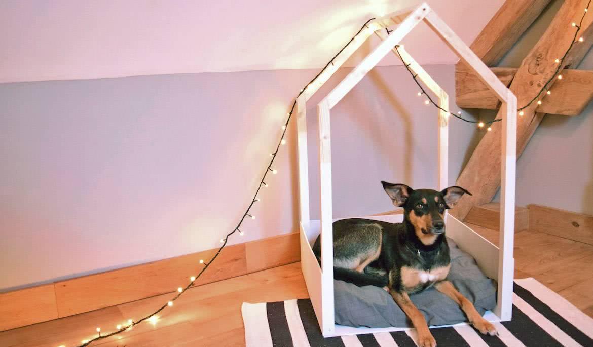 Если животное весит больше 20 кг, то целесообразно соорудить обычную мягкую лежанку, используя старый свитер. Другой вариант – будка для собаки в квартиру, сделанная из плотного картона. Внешне она выглядит неказисто. Чтобы ее преобразить, наклейте на домик обои или обтяните каркас обивочным материалом.