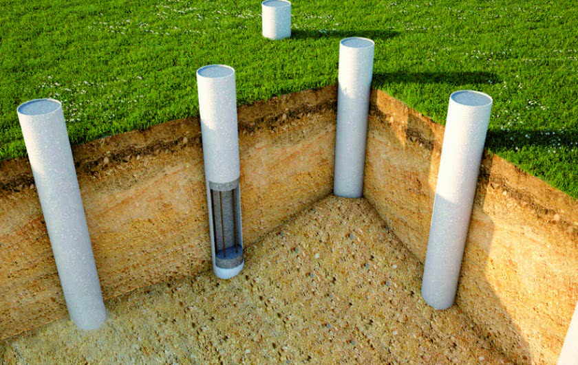Когда лунки под свайную конструкцию готовы, можно приступить к их заливке и армированию. В некоторых случаях уместным будет использование асбестоцементных труб. Они выступают своеобразной опалубкой, которая исключает растекание бетона. Труба устанавливается в подготовленную лунку, после чего делается небольшая подсыпка щебнем на днище. Заливается небольшое количество бетона в трубу, после чего она приподнимается на небольшую высоту. Делается эта процедура для того, чтобы образовалась подушка из бетона под самой трубой. Внутрь трубы выполняется укладка прутьев арматуры, чтобы укрепить конструкцию сваи под фундамент.