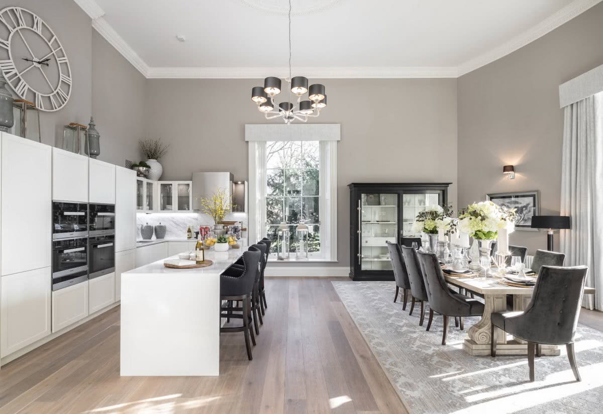 Дом имеет свои преимущества – немалый простор. Есть возможность организовать пространство с панорамными окнами и выходом в сад. А внутри создать несколько функциональных зон: кухню, обеденную зону и зону отдыха. Своеобразным отделяющим барьером между кухней и мягкой зоной отдыха станет барная стойка. Свет и ощущение свежести, обилия воздуха в пространстве обеспечат панорамные окна с видом на сад.