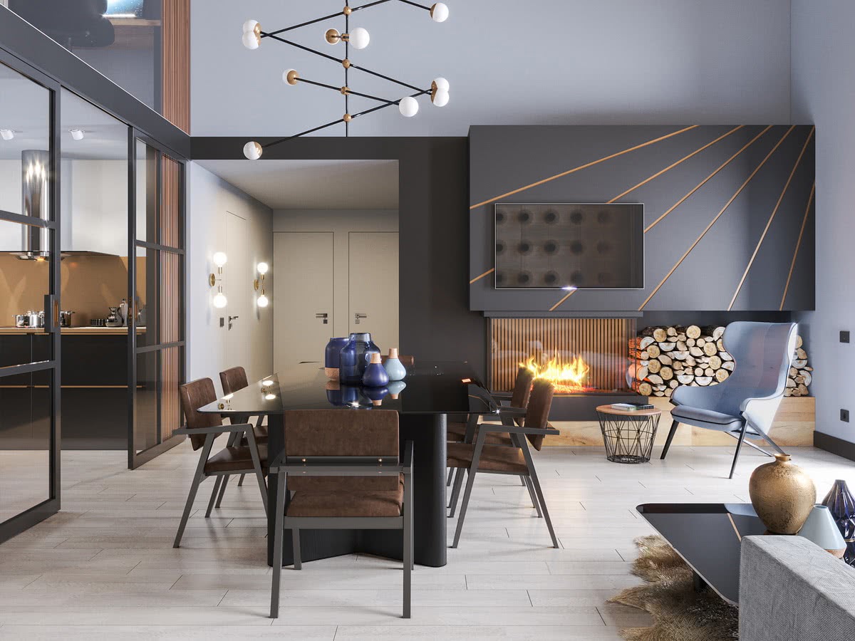 Еще один популярный выбор сегодня – лофт. Здесь пространство кухни-гостиной может быть дополнено и холлом. В итоге зона «холл-гостиная-кухня» становится центральной и занимает основную часть интерьера. Рекомендуется минималистический стиль с использованием натуральных материалов. Отлично будут смотреться деревянные балки, кирпичные стены и натуральный камень для оформления всей центральной части этой зоны.