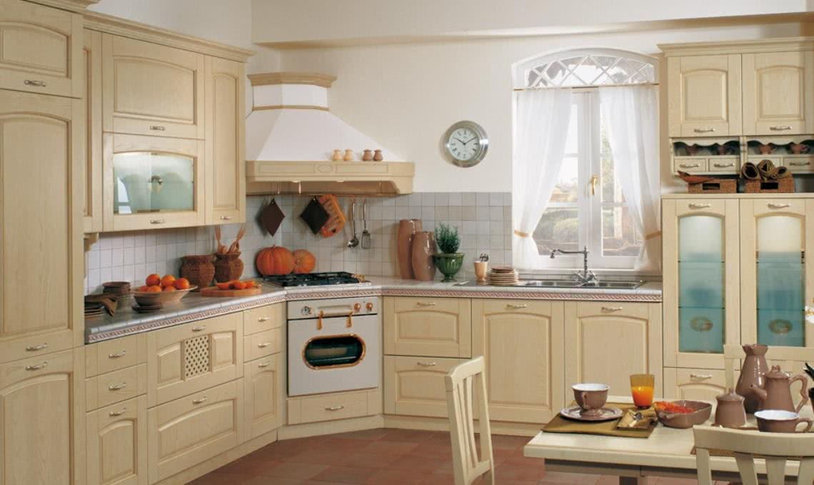 Угловая кухня «прованс» с мозаичным фартуком и рабочей зоной вместо подоконника