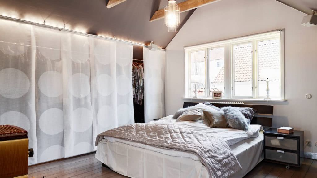 Для того, чтобы сэкономить лишние квадратные метры спальни, гардеробную можно установить в углу. Это будет не только практичным и довольно-таки удобным вариантом, но и достаточно стильным и фактурным. Если на такую зону выделяется небольшая сумма, отличным решением станет разделение комнаты напополам посредством плотной шторы, за которой будет находиться специально отведенное место для хранения одежды.