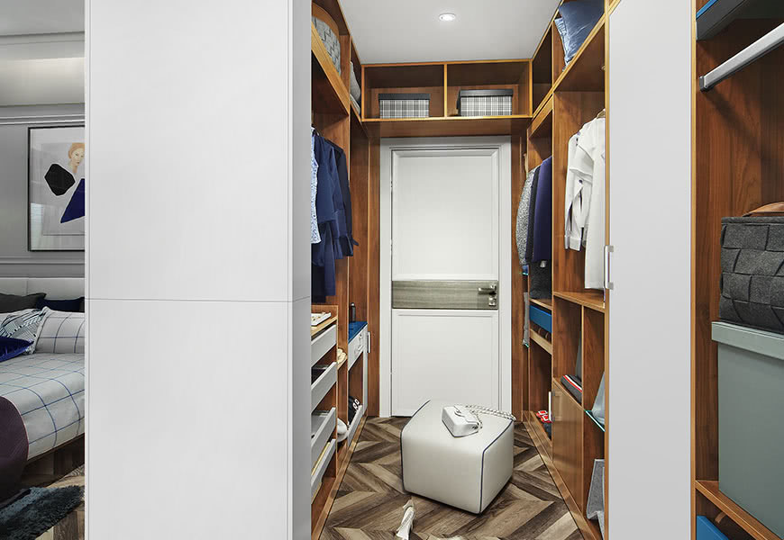 Интерьер гардеробной можно использовать для хранения полотенец или постельных принадлежностей. Вы также можете использовать мебель для гладильной доски — все, что вам нужно, это спланировать узкий шкаф для этого предмета, который будет отделен стеной от места для одежды.