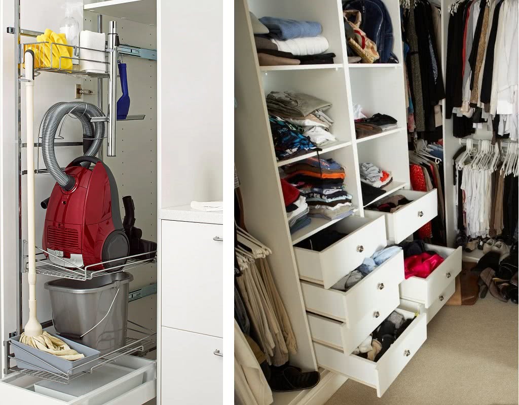 Стандартная кладовка небольшого размера, поэтому установить в ней мебель невозможно, следует основательно продумать расположение вещей. Идеальным решением будет оборудовать её стеллажами, выдвижными или поворотными ящиками, на вертикально расположенной оси. Удобный вариант для размещения вещей — закрепленный на потолке лифт.