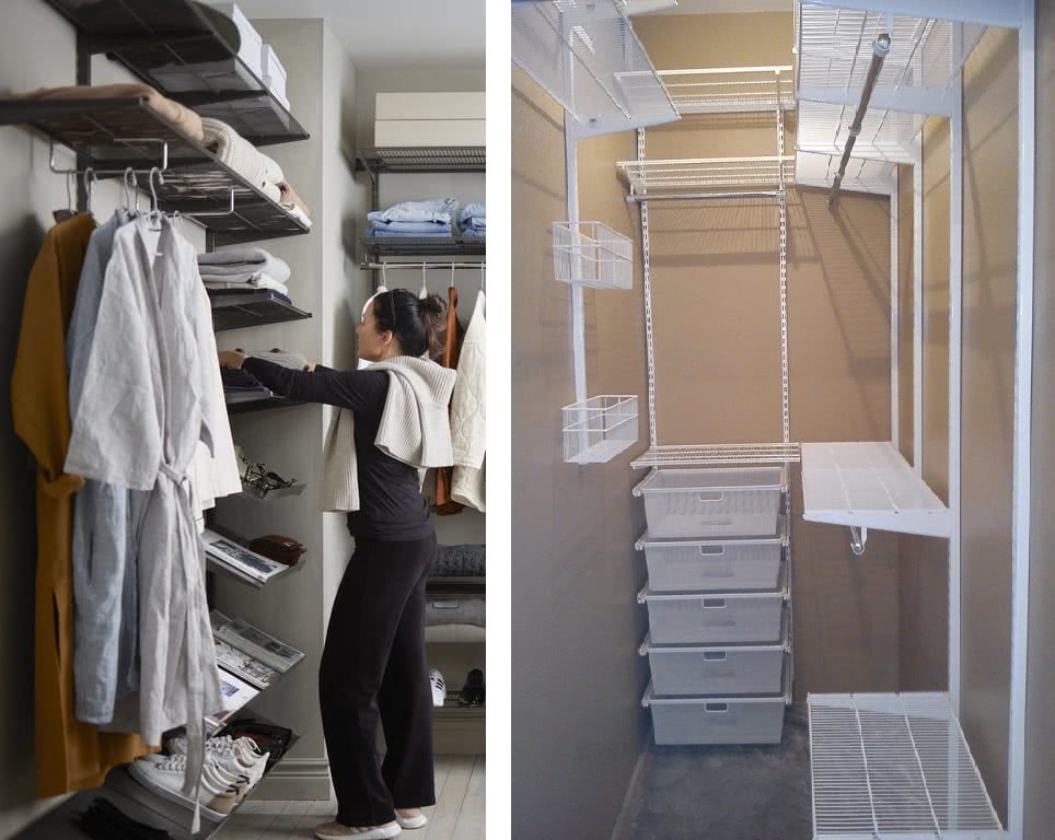 Очень практичным и удобным оказывается применение сетчатых настенных систем хранения типа Elfa, Aristo, Larvij и других. Отсутствие боковых стенок позволяет и эффективно задействовать угол. При таком подходе гардеробная из кладовки 1,1 на 1,5 может иметь даже П-образную планировку, с задействованием трех стен под хранение.