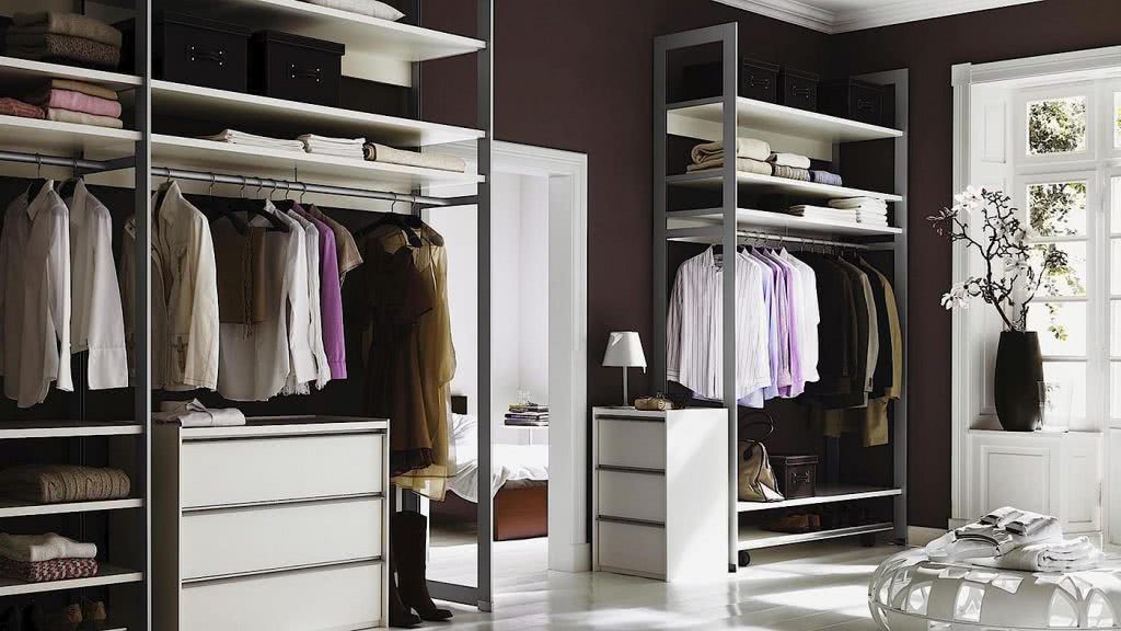 Характеристики и вместительность гардеробной зависят от вида конструкций. Популярная каркасная состоит из металлических стоек, на которые навешивают дополнительные элементы. Отверстия в «скелете» позволяют монтировать полки, штанги на разной высоте, добавляют новые модули. В небольшой комнате используют вариант открытого типа (бездверный), увеличивающий вместительность.