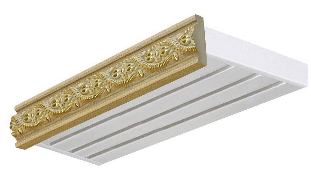 Главная «изюминка» этого изделия – это орнамент на багете. Имитация под дерево и узоры в классическом помпезном стиле будут гармонично смотреться с трехрядной композицией тюля, портьера, ламберкена.