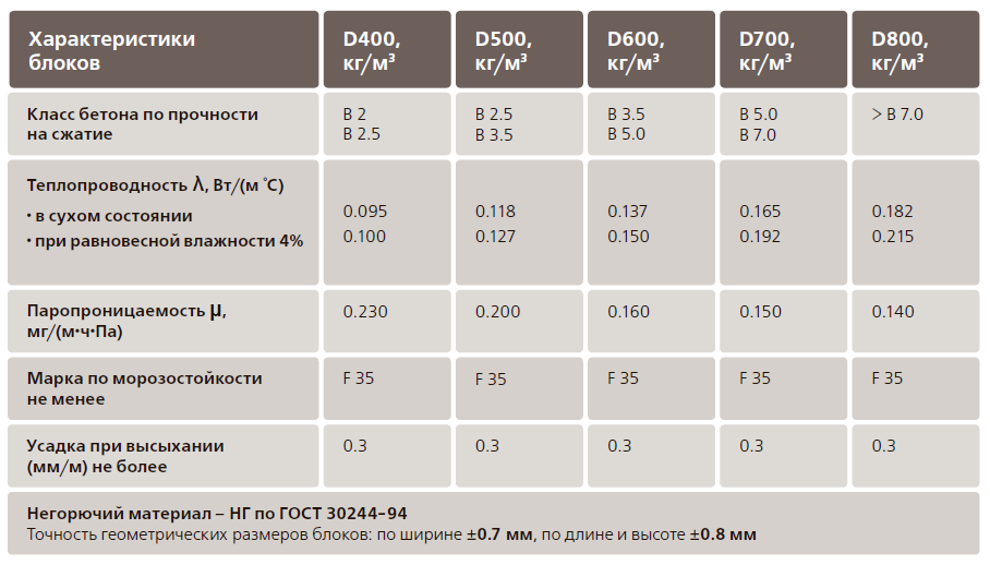 Ниже приводится таблица, иллюстрирующая другие параметры, которыми отличаются газосиликатные блоки разных марок.