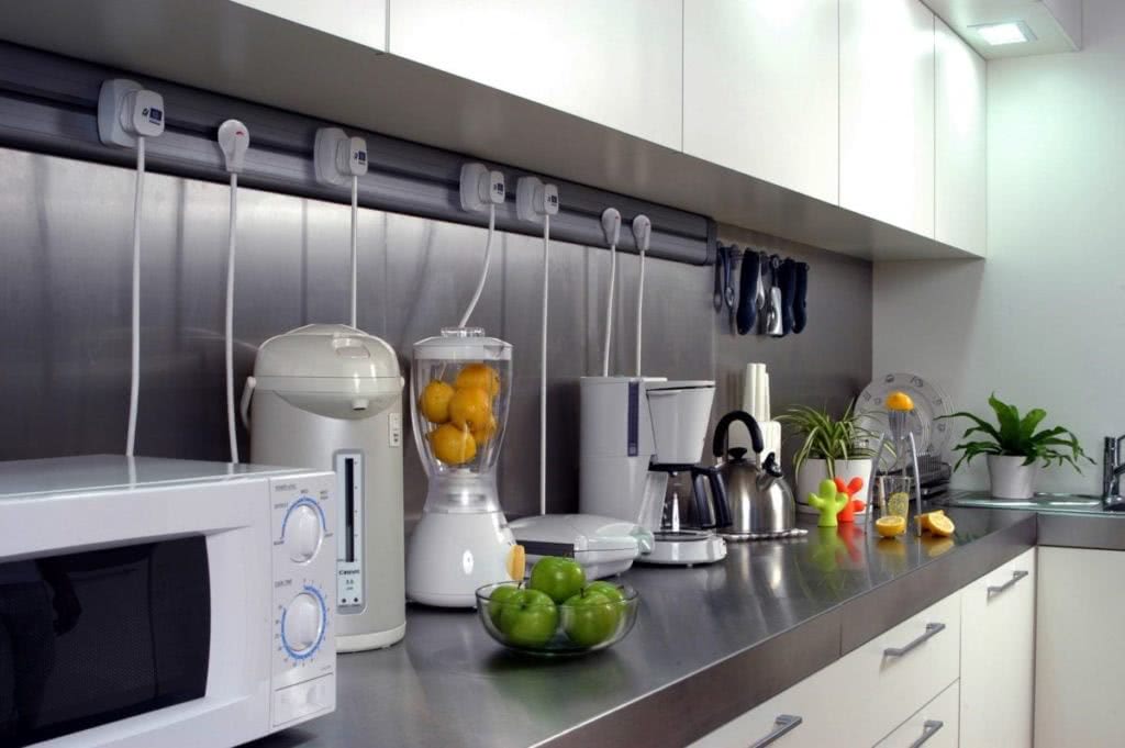 - безопасность электросети. Размещенные практически вплотную к рабочей поверхности розетки попадают в зону риска – брызги, случайное намокание во время очистки столешницы, мелкий мусор способны сильно затруднить работу устройства и даже привести к короткому замыканию;