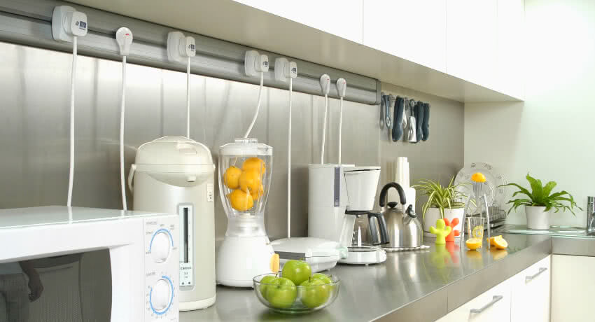 Количество розеток рассчитывается с учётом единиц бытовой техники. Учитывайте и такой момент, что год от года её становится всё больше, что потребует дополнительных приспособлений. Существуют определённые приборы, которые на кухне всегда присутствуют в кухне: холодильник, газовая или электрическая плиты, электрический чайник, вытяжка и микроволновка. Остальные появляются с ростом благосостояния семьи. Поэтому проводя ремонт на кухне, учитывайте, какие приборы уже имеются, и какие планируется приобретать в ближайшем времени.