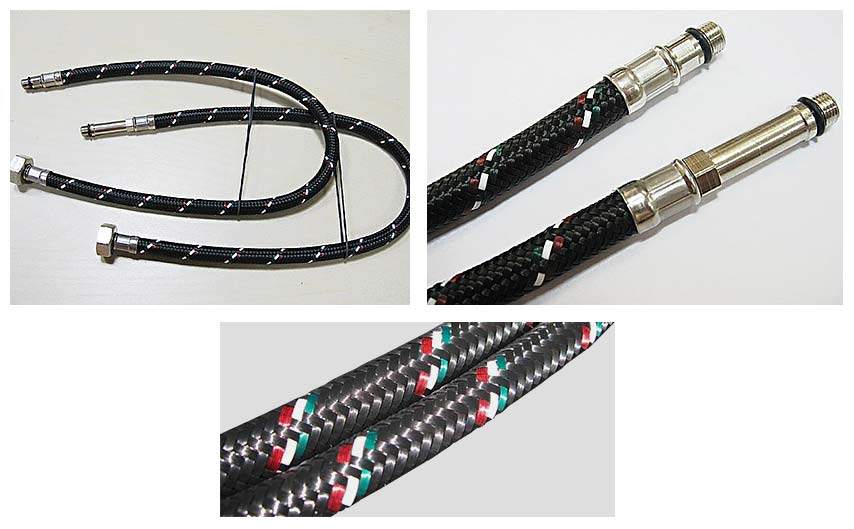 армированная подводка. Устройство представляет собой резиновый шланг, который для дополнительной прочности армирован металлическими нитями. В качестве нитей для оплетки могут применяться: нержавеющая сталь, нейлон, алюминий;