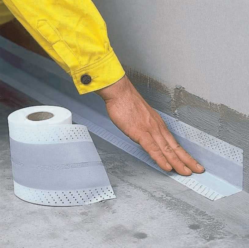 - Все соединения стен и пола (угловые) нужно перекрыть специальной сеткой – на ней уже имеется слой эластомера, который отличается водонепроницаемостью. Чтобы ускорить этот этап гидроизоляционных работ, специалисты рекомендуют приобрести уже готовые угловые изделия – они реализуются с пометками для внутренних или внешних углов.