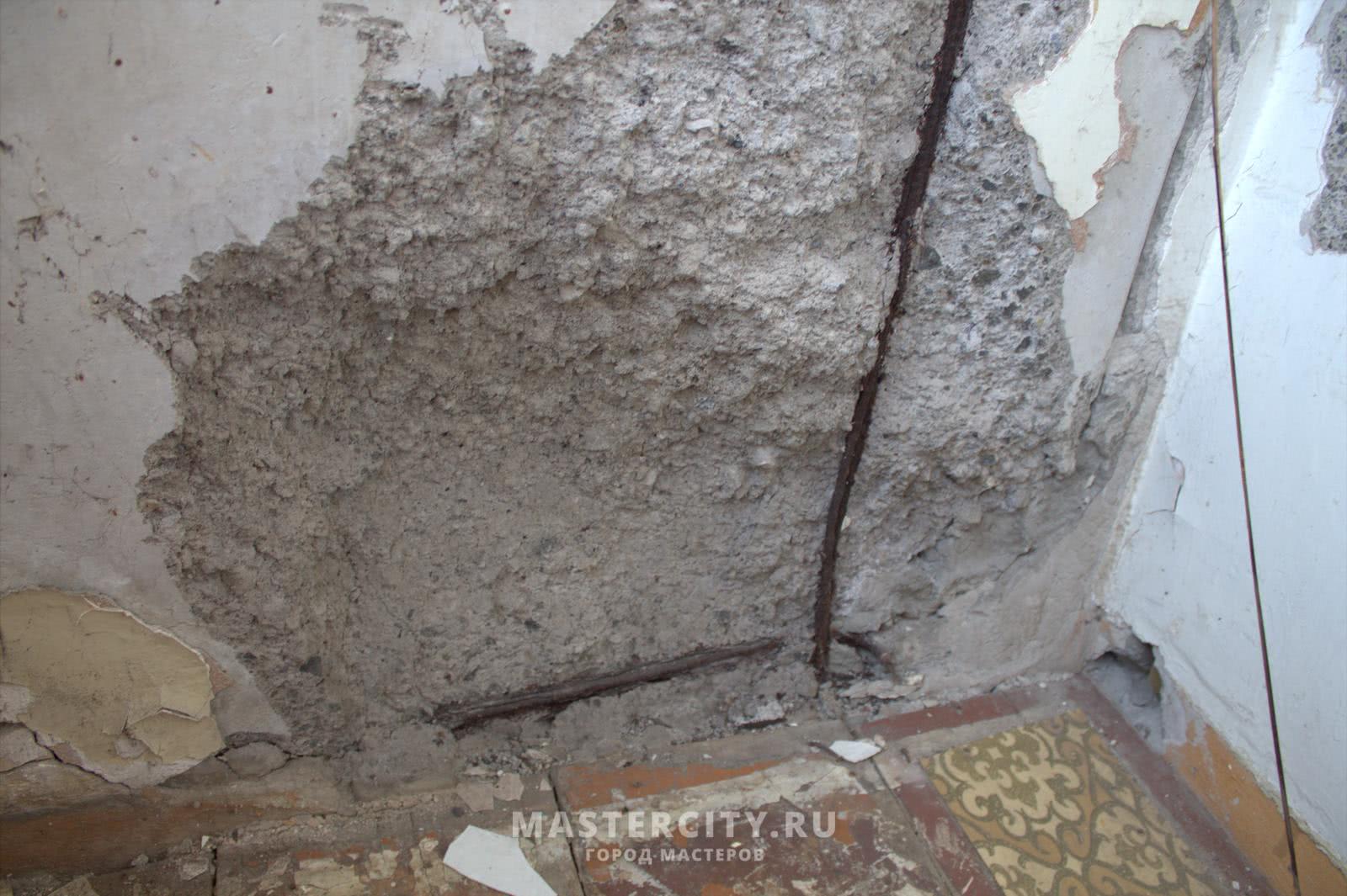 - Если на плите присутствуют мелкие трещины, их немного расширяют перфоратором. Это позволит раствору проникнуть глубже и хорошо укрепиться. Крупные трещины выравниваются до П-образной штрабы.
