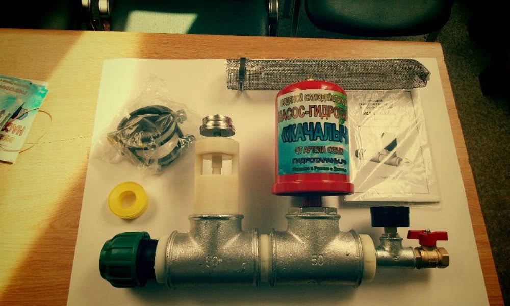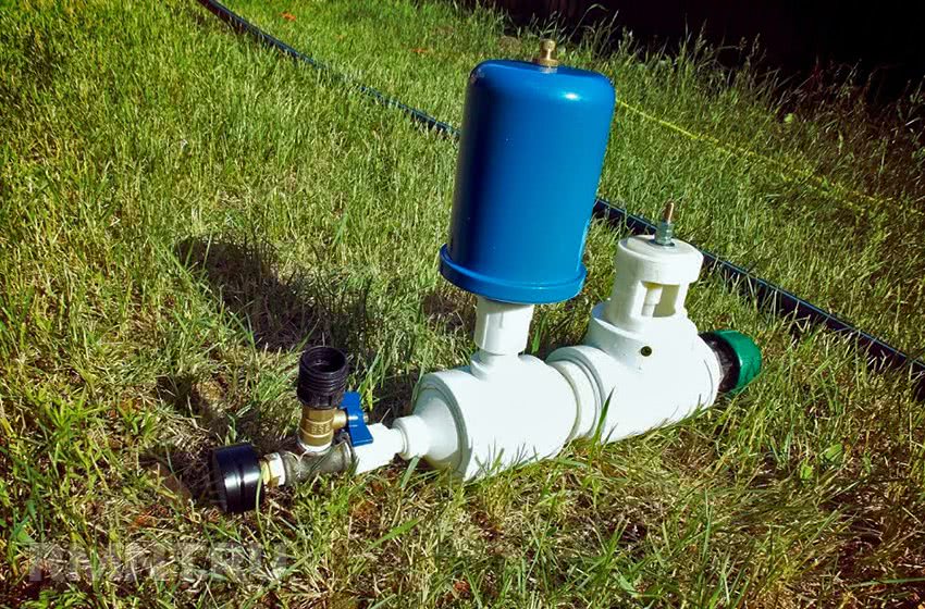 Для удобства работы с гидротаранным насосом на первый обратный клапан стоит установить дополнительный кран, хотя можно обойтись и обычной заглушкой. Пока она закрыта, вода через насос проходить не будет. На фотопримере ниже можно увидеть уже собранную конструкцию, на которой сверху установлен расширитель.