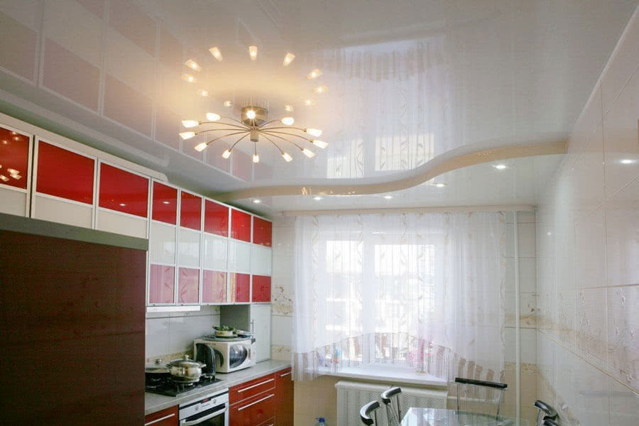 Глянцевые многоуровневые натяжные потолки крепят на гипсокартонную конструкцию, которая позволяет сделать несколько уровней. В них хорошо прячется коммуникации, можно обеспечить хорошее освещение в рабочей зоне, кроме того, они красиво украшают интерьер. Второй уровень может быть простой геометрической формы (полукруг, круг, «П», прямоугольник, эллипс).