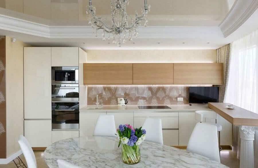 Глянцевый потолок на кухне наиболее целесообразно использовать для зонирования пространства – отделения обеденной зоны от места приготовления пищи.