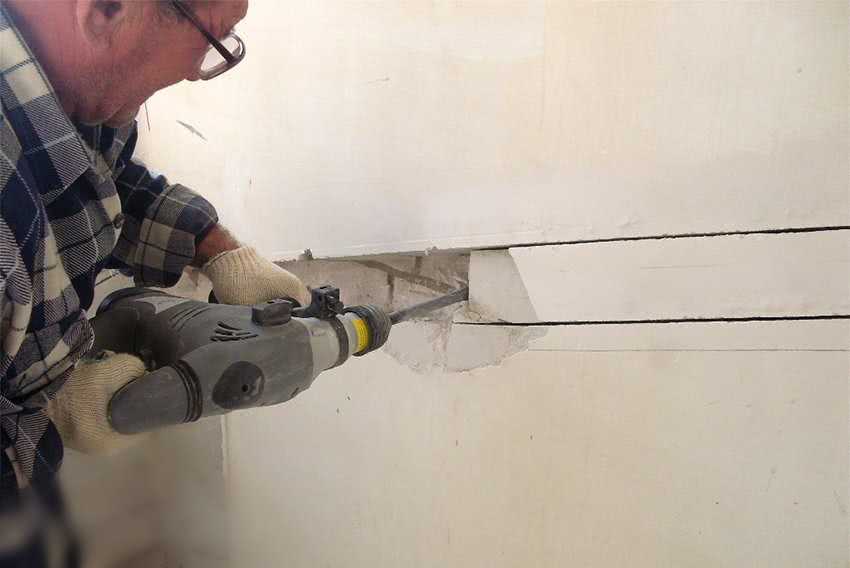 - При помощи перфоратора выбивается тело стены, заключенное между прорезями.