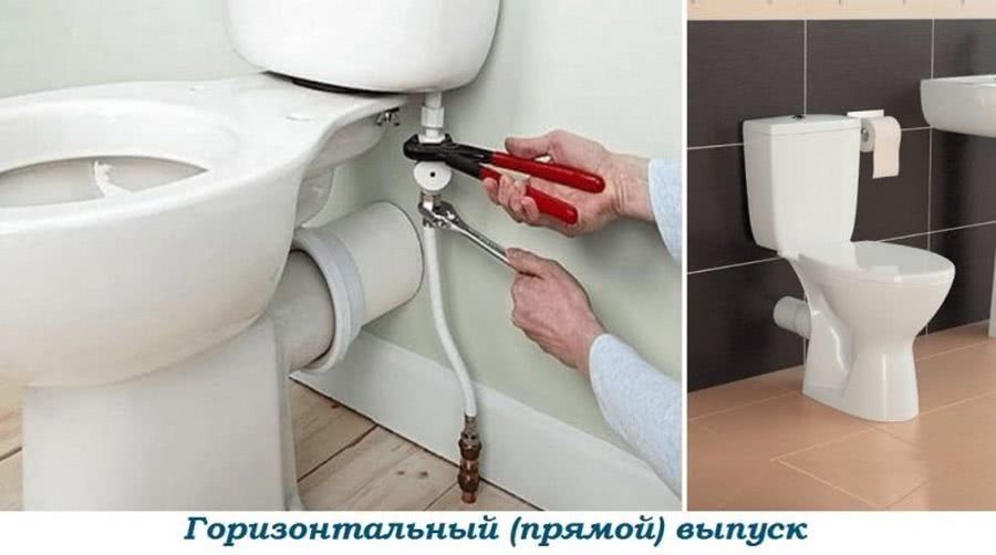 Горизонтальный выпуск называют еще прямым — это унитазы, сливные патрубки которых направлены назад перпендикулярно стене. Такое подключение упрощает обслуживание санприбора и визуально придает конструкции устойчивости, но выполняется с обязательным использованием уплотняющей манжеты.