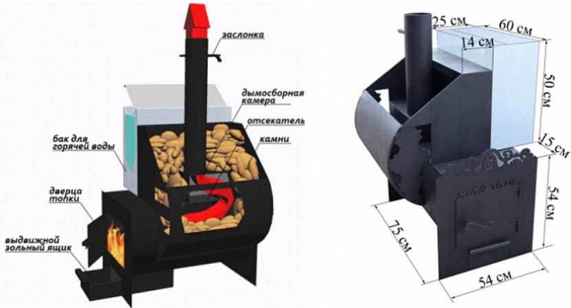 Бак для воды и часть топки располагаются в моечном отделении, обогревая его
