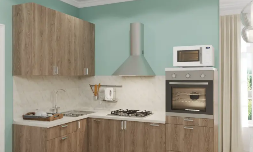 - Угловая кухня – самое распространенное размещение, так как позволяет с наименьшими затратами сформировать «рабочий треугольник». В Леруа Мерлен можно найти угловые модули разного вида – трапециевидные и Г-образные, что, в свою очередь, позволяет варьировать положение мойки.