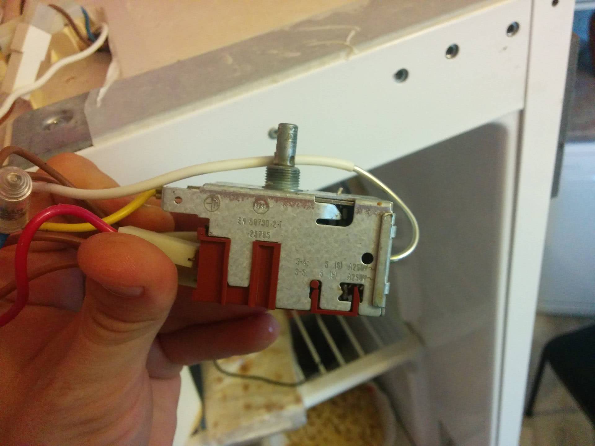 Неисправный терморегулятор (он же термостат) приводит к тому, что холодильник после разморозки не охлаждает. Эта деталь находится рядом с ручкой установки температурного режима.