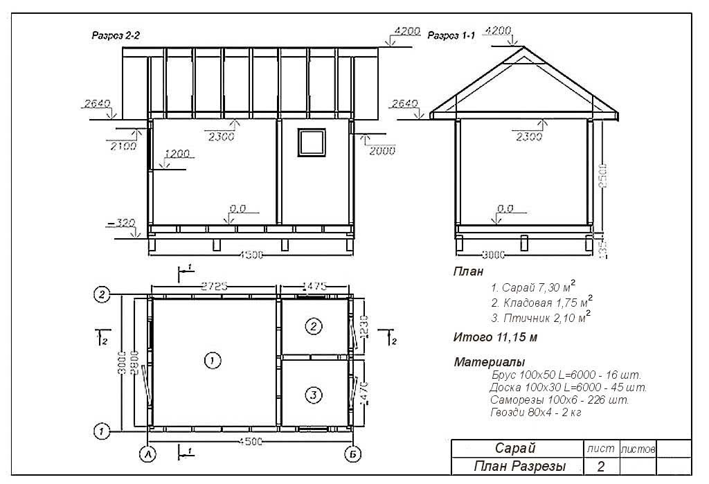 Несмотря на то, что это сарай, сооружение считается капитальным, поэтому необходимо иметь чертеж, как основу для расчета материалов и, как основу для строительства. При составлении схемы необходимо учитывать ряд факторов, которые повлияют на конечный результат, в том числе и в плане экономии материалов и средств. В обязательном порядке необходимо учитывать действительные размеры строительных материалов, чтобы уменьшить количество отходов. Поэтому размеры сарая должны быть сопоставленными с размерами, как строительных, так и отделочных материалов.