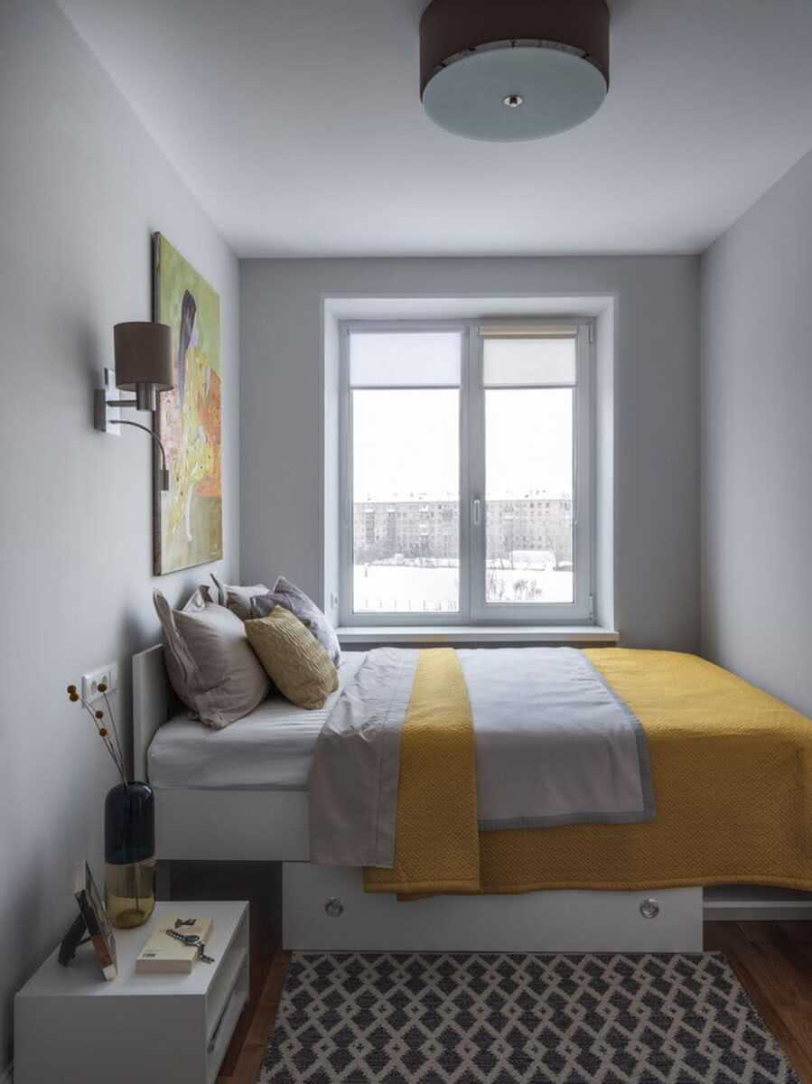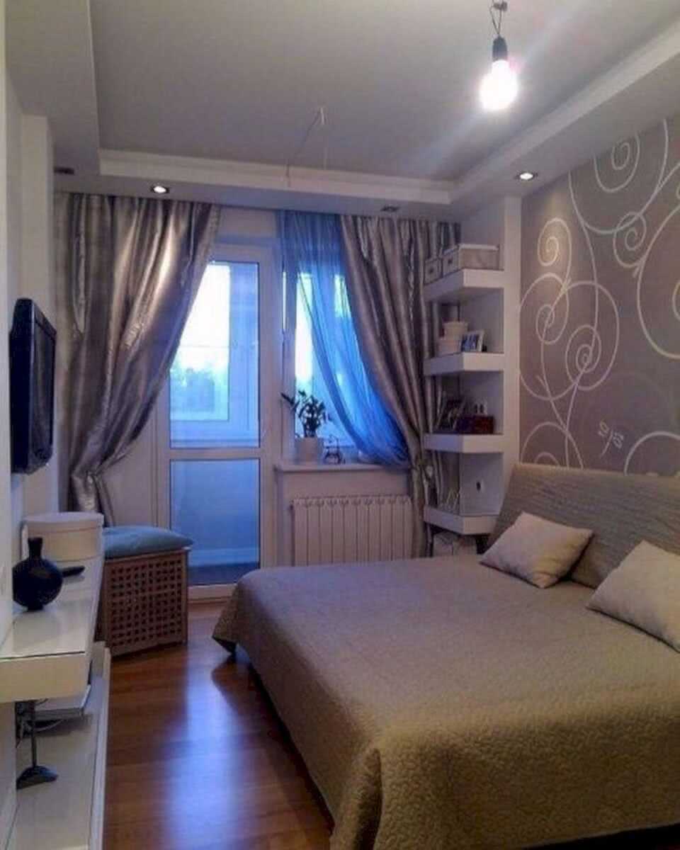 Пространство можно разделить при помощи тонкой перегородки, скрыв при этом кровать из поля зрения. Разделить комнату на зоны можно при помощи нитяных или стандартных штор, раздвижных дверей.