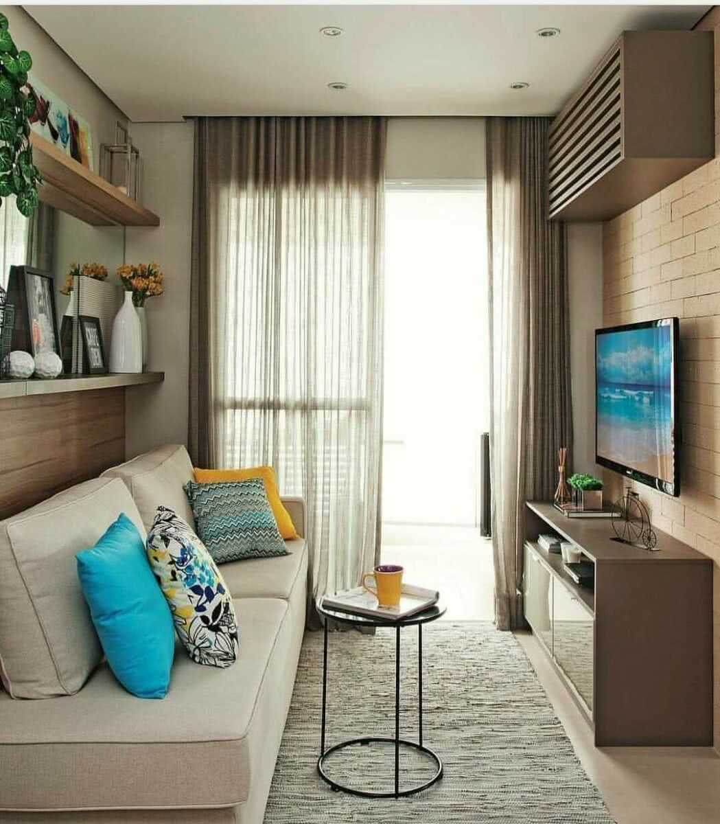 В непосредственной близости к двери можно поставить маленький диван и столик. Организовать место для хранения вещей можно в подвесных полках, сэкономив пространство. Телевизор в маленьких помещениях лучше располагать на стене.