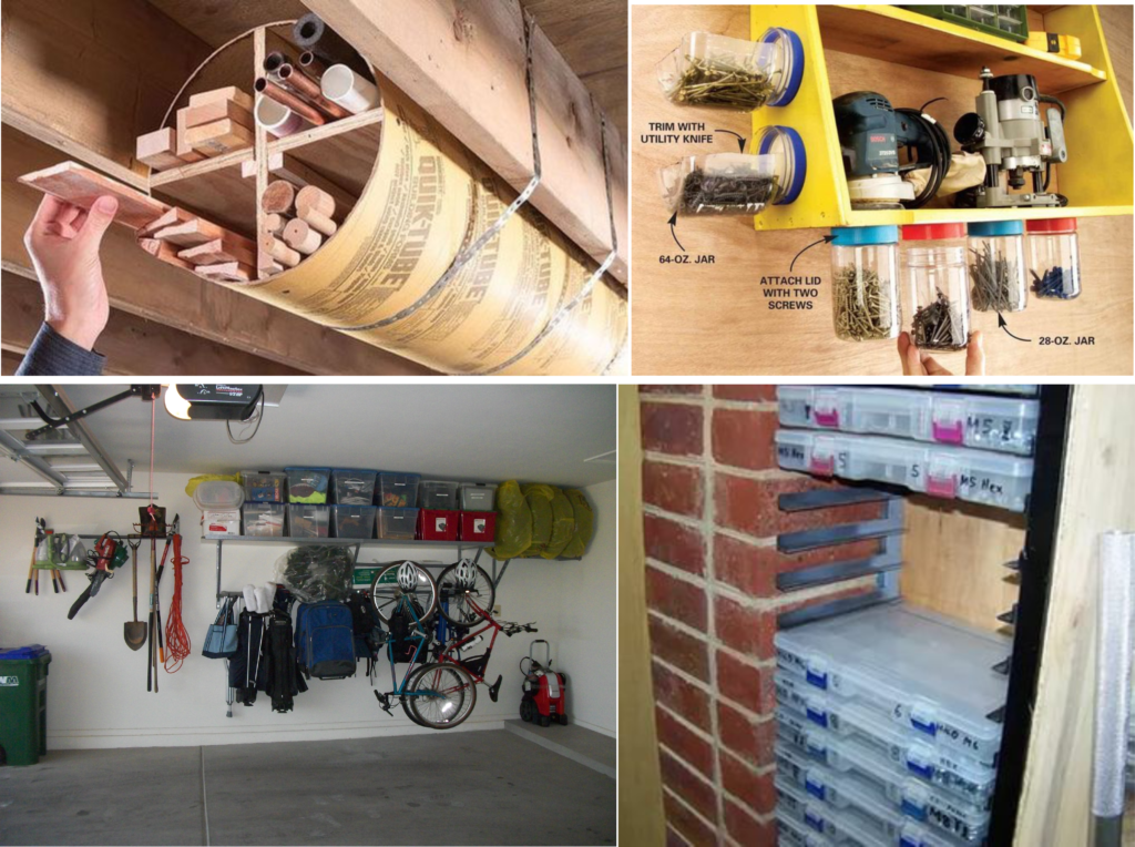 Метизы, дюбели и другие мелочи удобно хранить в прозрачных баночках, приклеенных крышкой к полке. Ещё одна маленькая хитрость – магнитная полоса, наклеенная на мебель, поможет здорово сэкономить место.