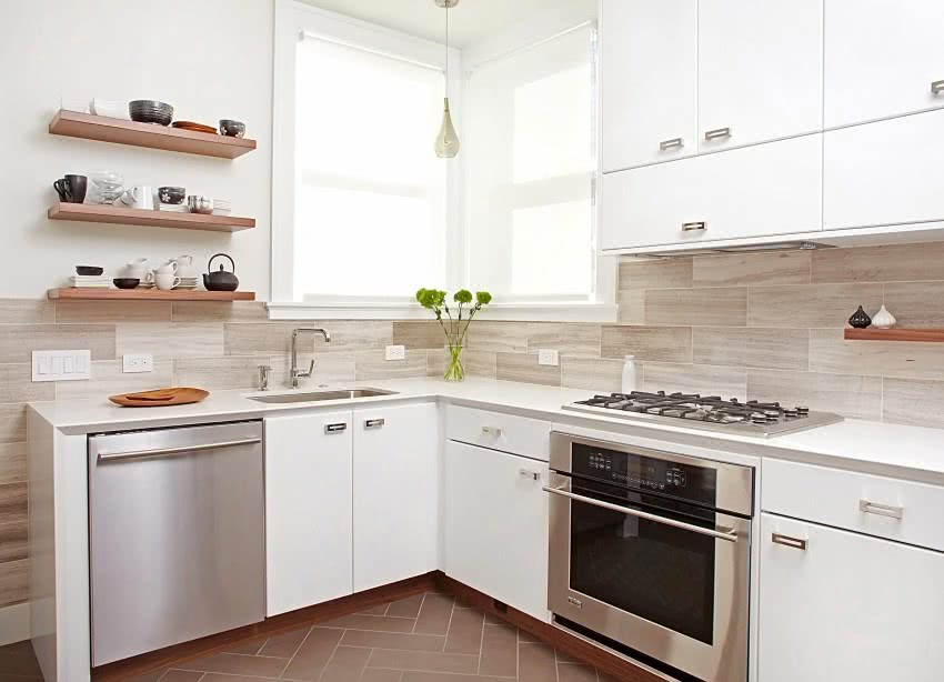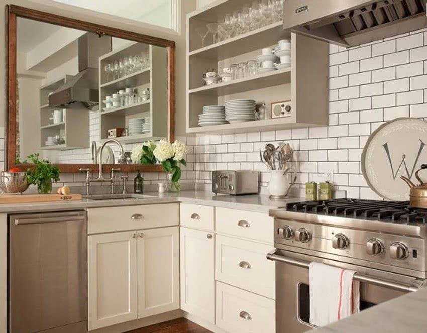 | Полочки для полезных деталей и мелких мелочей | Практичность – на полках можно расставить посуду, мобильность – содержимое можно изменить | Требует регулярной чистки | Прованс, кантри, шале |