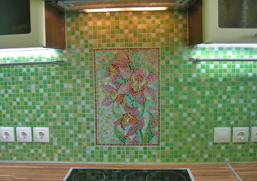 Украсить фартук кухни можно самоклеющейся пленкой с ярким рисунком. Ее преимуществом является легкость мытья, недорогая стоимость и простота в применении. При желании пленку можно быстро и недорого поменять на новую.