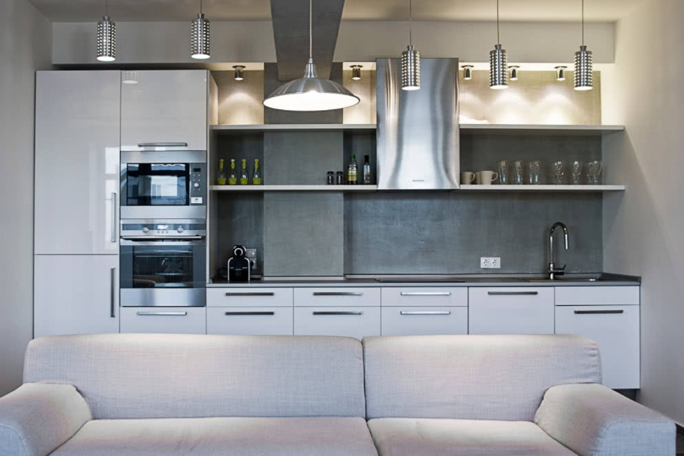 Актуальные отделочные материалы – металл, стекло, дерево, натуральный камень, керамика. На бытовой технике экономить не стоит. В настоящее время современным техническим требованиям соответствуют микроволновки, холодильник, интегрированные поверхности, духовой шкаф. Освещения должно быть много. Играя с цветами и яркостью света можно зонировать кухню. Светильники должны соответствовать стилю помещения.