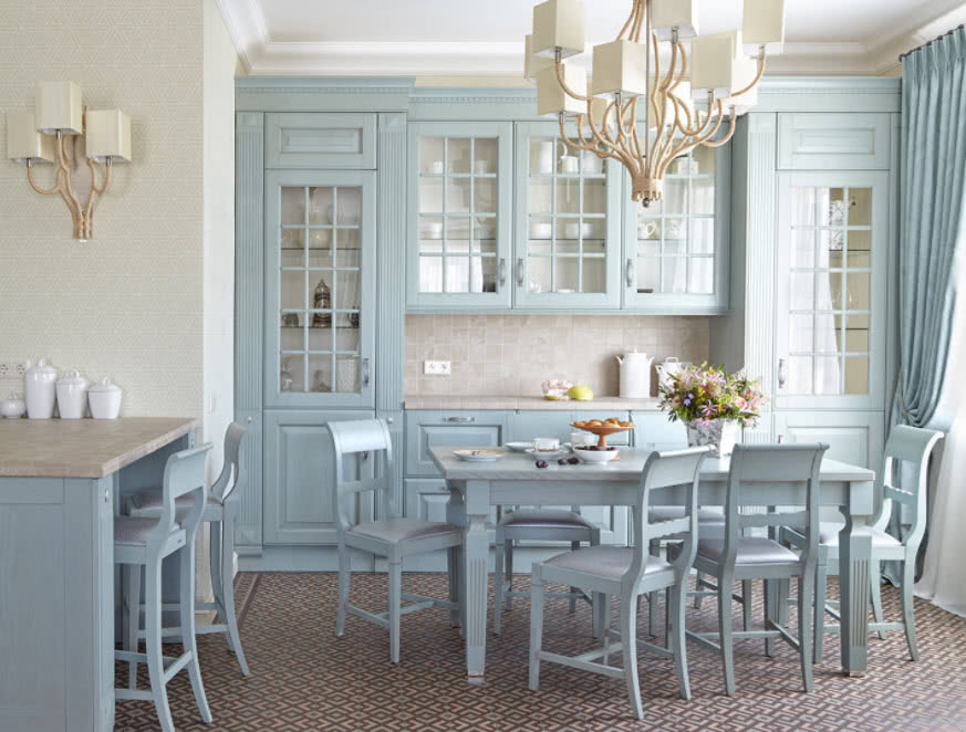 Если кухня большая и хозяин любит роскошь, то ему подойдет классический стиль. Здесь используется дорогая деревянная мебель с ручной резьбой или ковкой, мягкие обеденные кресла. Также хорошо сюда впишется огромная люстра, вазы, картины и прочие элементы, подчеркивающие роскошь и материальное благополучие хозяев.