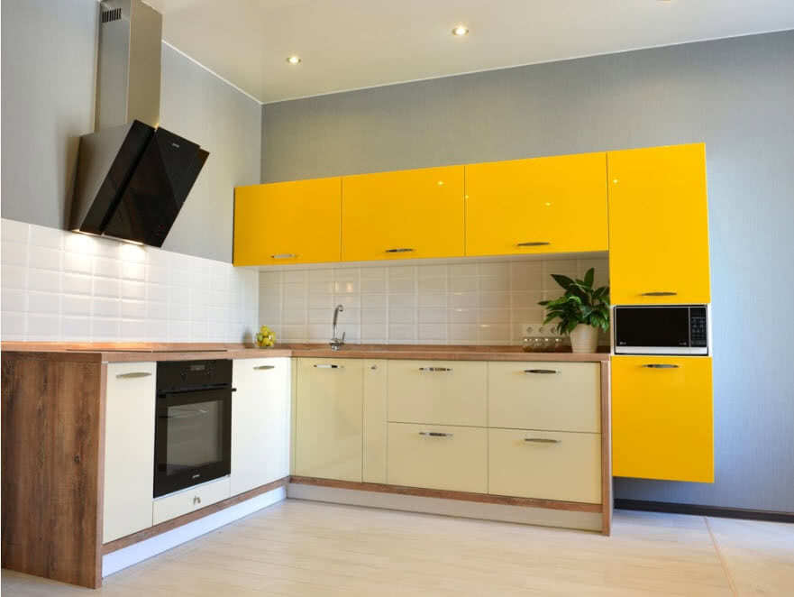 Для маленькой кухни подходит еще и угловая планировка, когда гарнитур устанавливается в виде буквы Г. Это позволяет максимально задействовать один из углов.