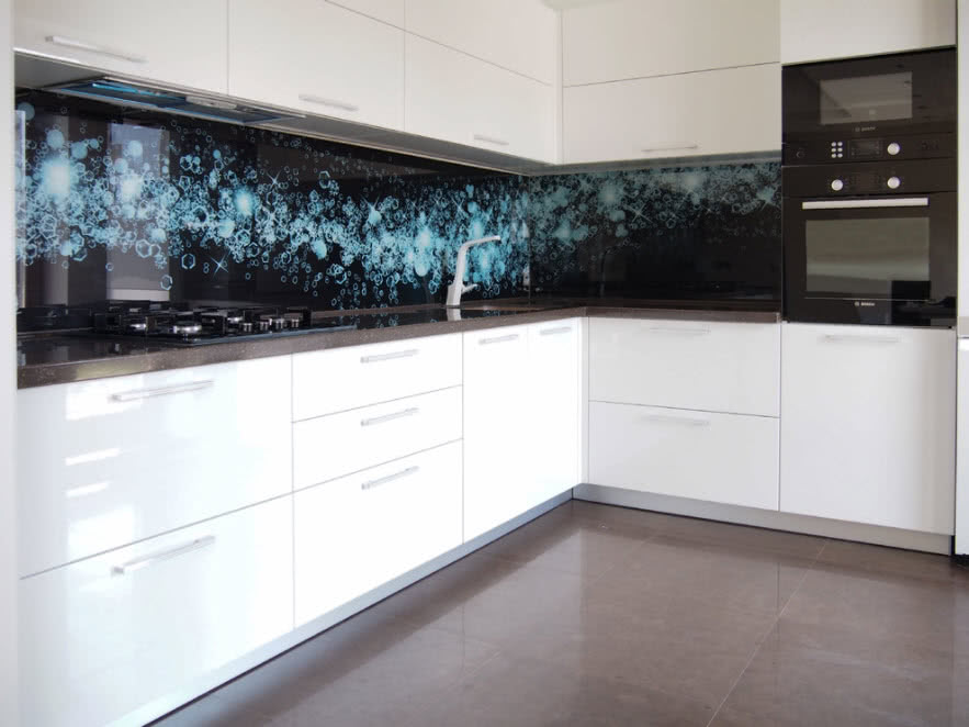 Если же у проектировщика присутствует вкус, да еще он и не экономил изо всех сил, можно попробовать создать довольно привлекательный дизайн. На третьем примере мы видим недорогой фартук, собранный из плит МДФ. Плита рядом с ним, судя по всему, электрическая, потому вероятность возгорания сильно снижается. Материал хорошо гармонирует с кухонным гарнитуром, потому образ кухни выглядит даже несколько дороже, нежели есть на самом деле.