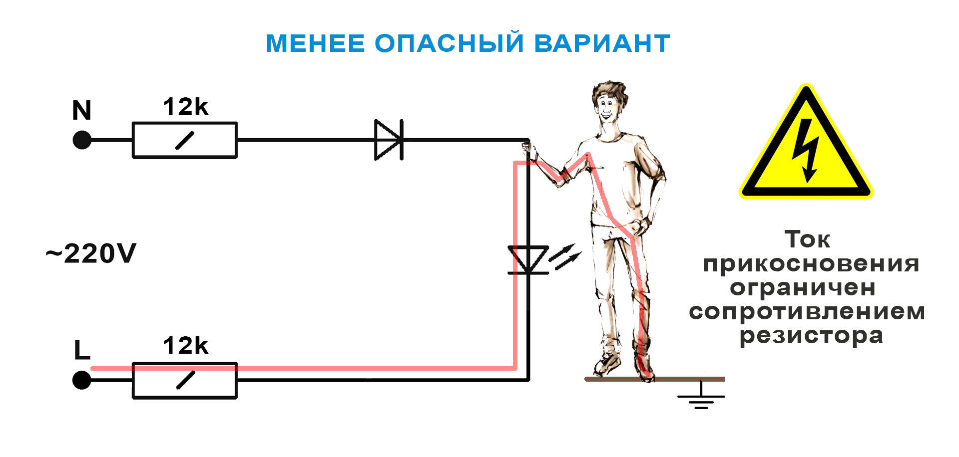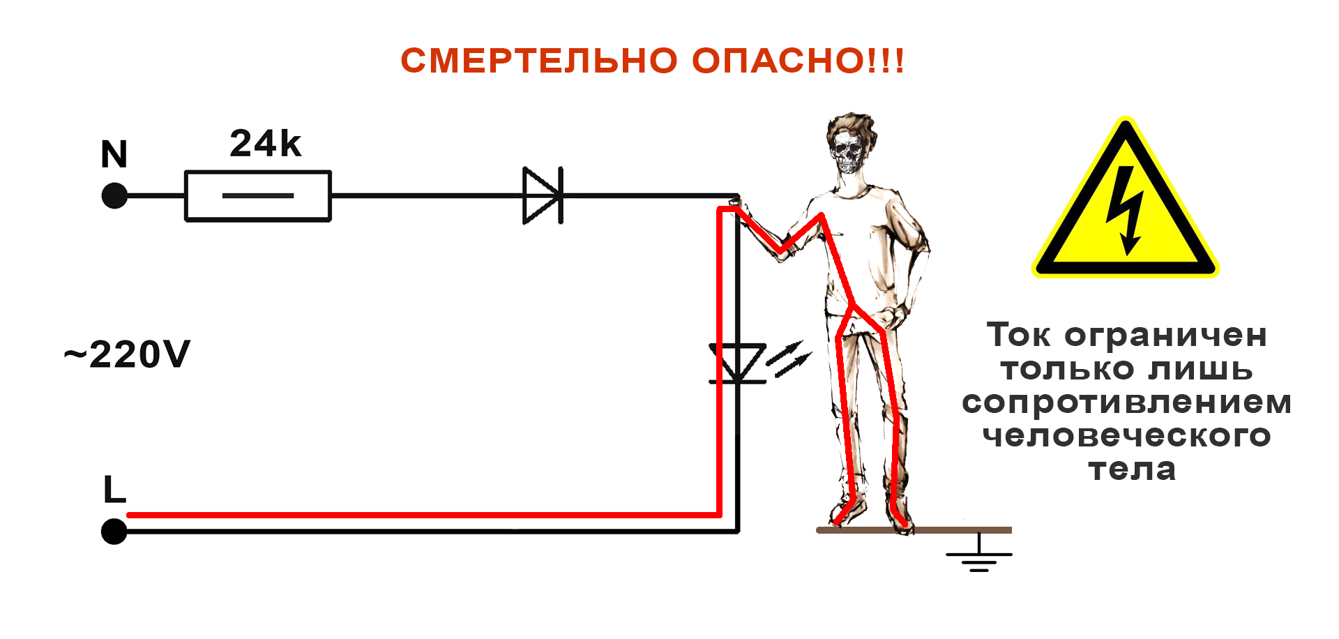 Внимание! Все простейшие схемы подключения светодиодов в 220 вольт имеют непосредственную гальваническую связь с сетью, поэтому прикосновение к ЛЮБОЙ точке схемы — ЧРЕЗВЫЧАЙНО ОПАСНО!