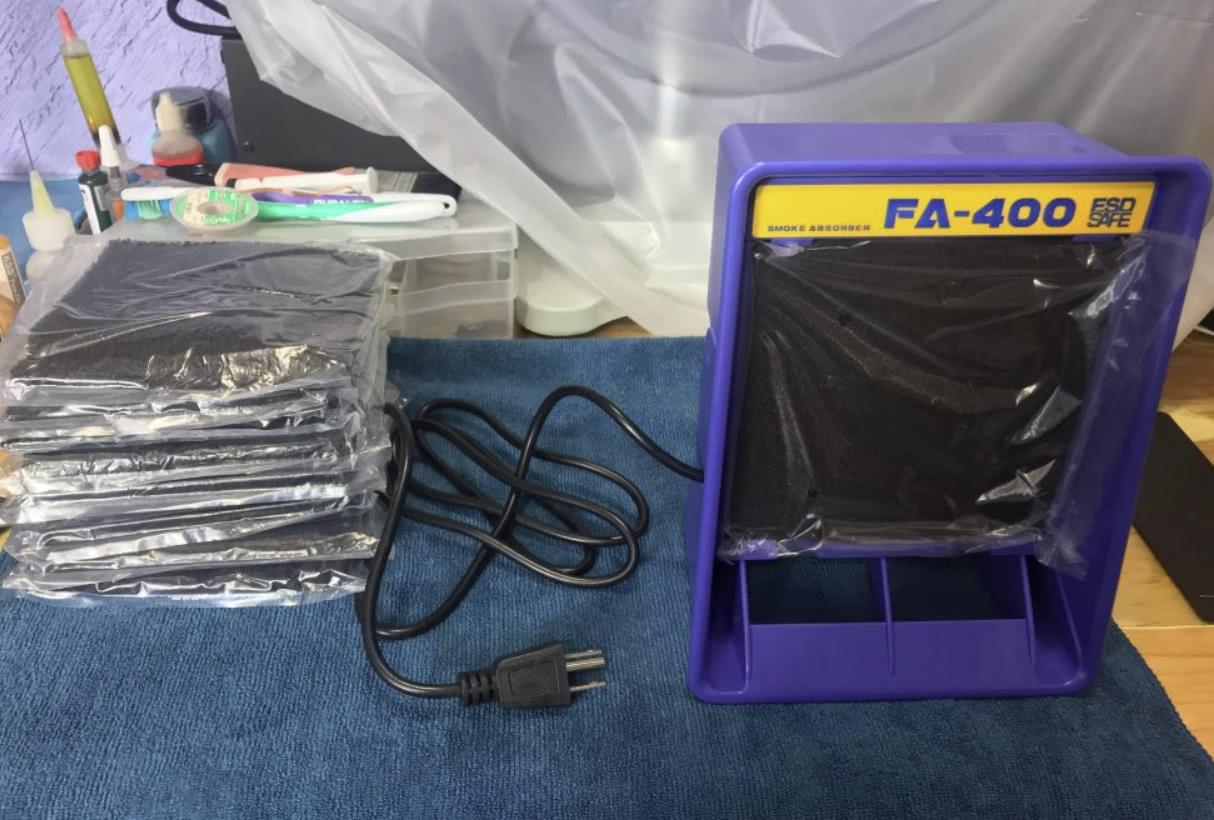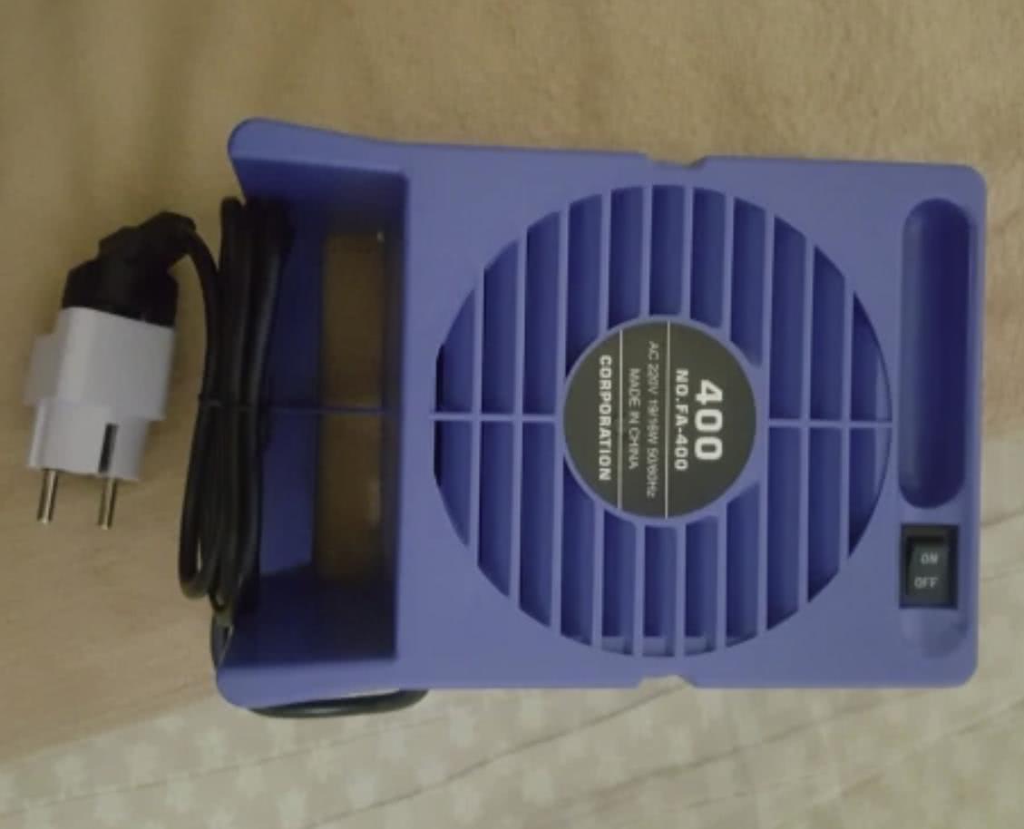 Во время работы не стоит забывать и о здоровье. Все-таки пайка сопровождается выделением не самых полезных веществ, включая всякие смолы. Вот этот небольшой портативный поглотитель дыма сделает процесс ремонта плат более безопасным.