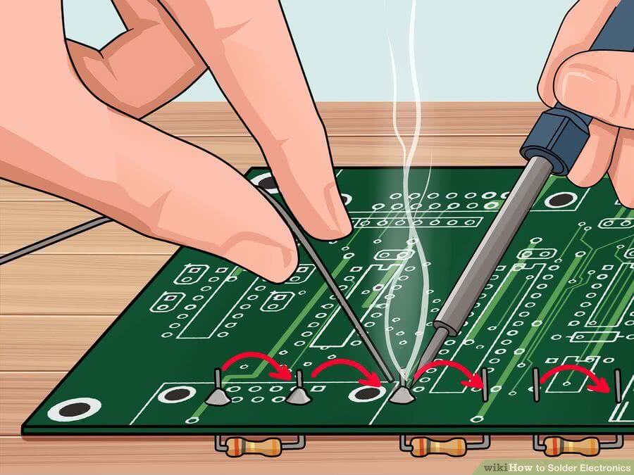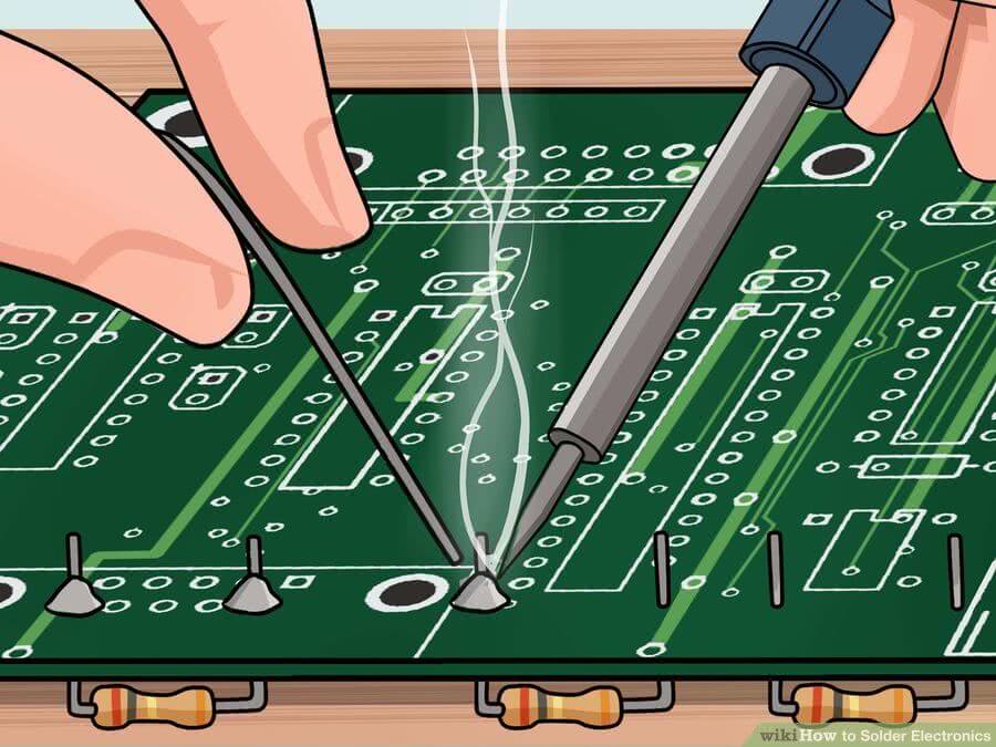 Для начинающих рекомендуется использовать выводные электронные компоненты, которые вставляются в отверстия в печатной плате. Эти отверстия в идеале должны быть металлизированы, чтобы надежно соединять верхний и нижний слой платы. Правильная пайка других электронных компонентов, проводов и разъемов отличается применением других приемов пайки, но общий принцип остается тем же.