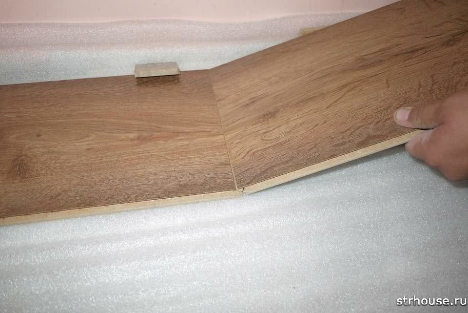 После этого, в торец первой доски под углом примерно 15 градусов заводится следующая ламель, которая выравнивается и совмещается с первой, а затем опускается вниз до срабатывания замка (иногда с характерным щелчком). При этом не требуется прилагать усилия, а тем более стучать по материалу молотком.