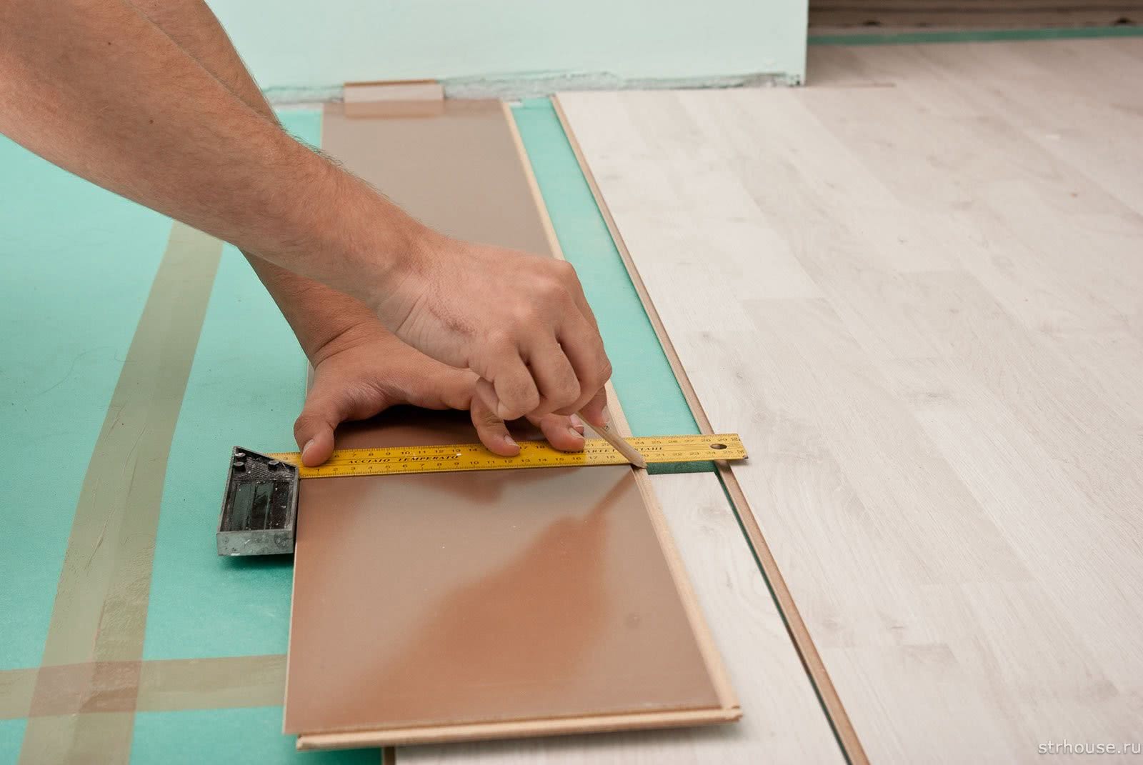 Все ламели в ряду собираются аналогично, а последняя, при необходимости, подрезается по длине. Сделать это проще всего по месту. Для этого необходимо повернуть ламинатную доску на 180 градусов лицевой стороной вниз и на стыке с предыдущей ламелью произвести разметку. Такой способ позволяет наиболее точно произвести подрезку ламината с обеспечением зазора.