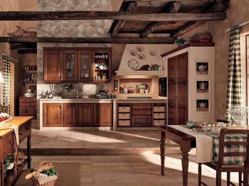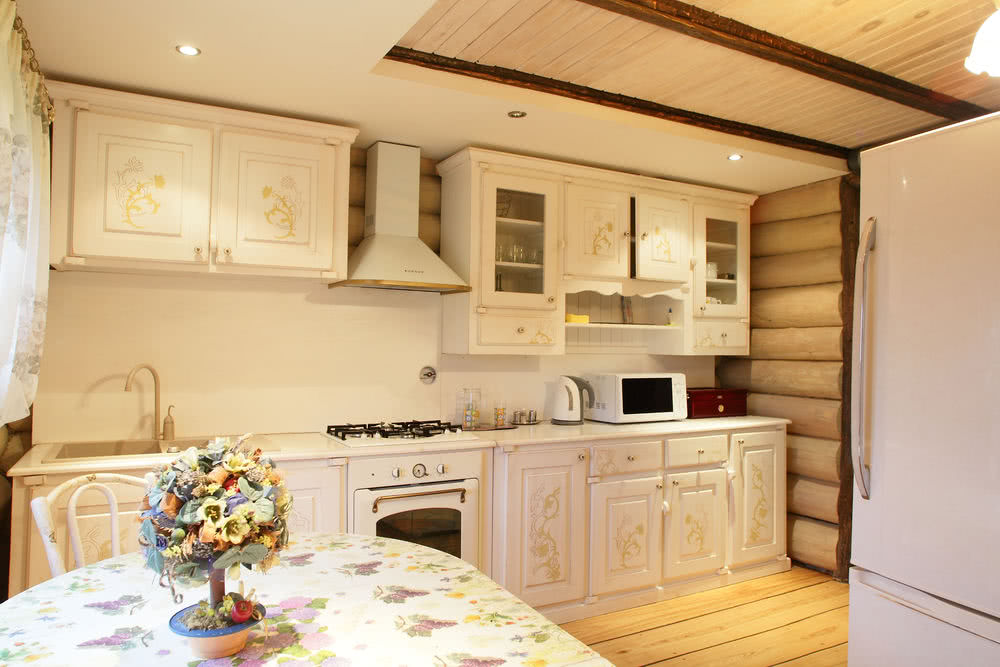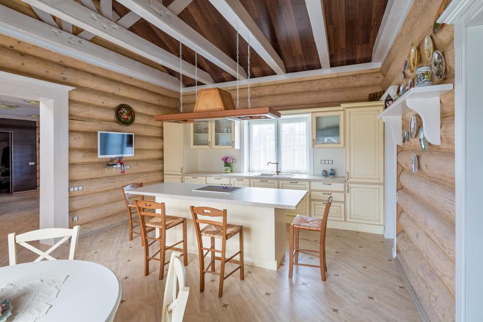 Набор оформительских инструментов для оформления дизайна кухни и любых других помещений деревянного дома зависит от типа постройки: