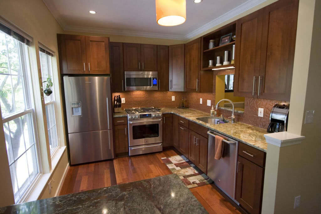 Используйте элементы со стеклянными фасадами, с ними небольшие пространства кажутся более открытыми. Дополнительный эффект создается при освещении, а значит можно и выставить всю свою любимую посуду и декоративные элементы. Маленькие кухни гораздо чаще встречаются в современных жилых помещениях, чем большие кухни. Есть много способов украсить и спроектировать вашу деревянную кухню и вот несколько отличных фото идей дизайна деревянных кухонь, которые вы можете попробовать сделать в своем собственном доме!