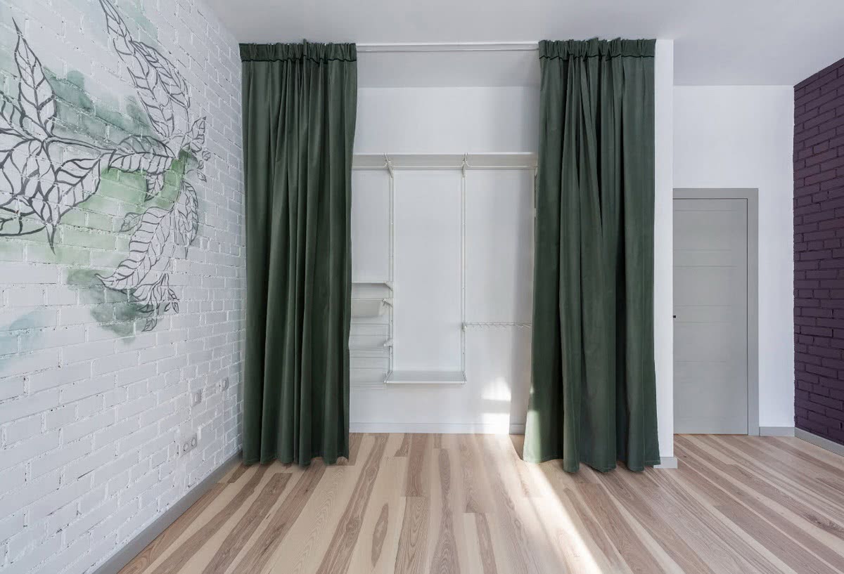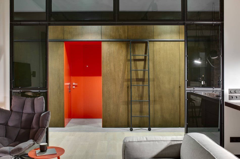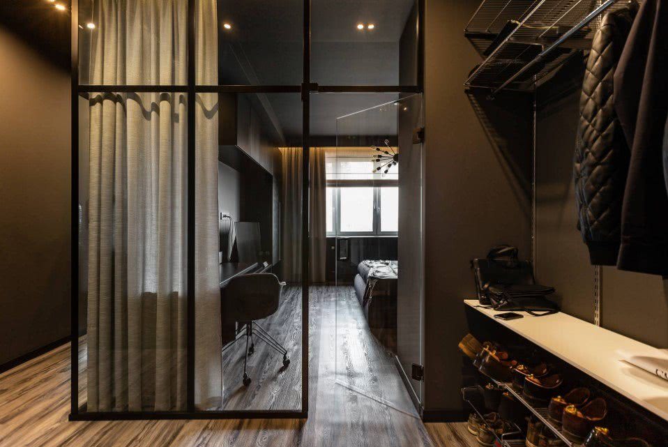 Малогабаритная комната с тёмными дверями красиво смотрится в стиле лофт. Это направление пользуется большим спросом из-за своей оригинальности. Для отделки помещения используется кирпичная кладка, светлая или тёмная древесина, а также штукатурка. Вместо массивного шкафа в коридоре можно установить удобную металлическую стойку или закрепить на стене крючки для одежды.