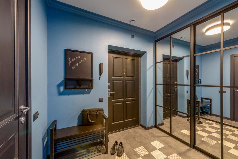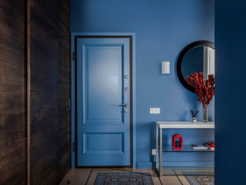 - Если ваш коридор очень длинный, то можете покрасить заднюю стену в темный цвет, чтобы приблизить сократить его с помощью оптического эффекта. Хорошей идеей является создание контраста между цветом стен и дверьми или только их рамами, чтобы уменьшить длину. Используйте контрастные цвета, например, синий и белый, или дополнительные, например, синий и желтый.